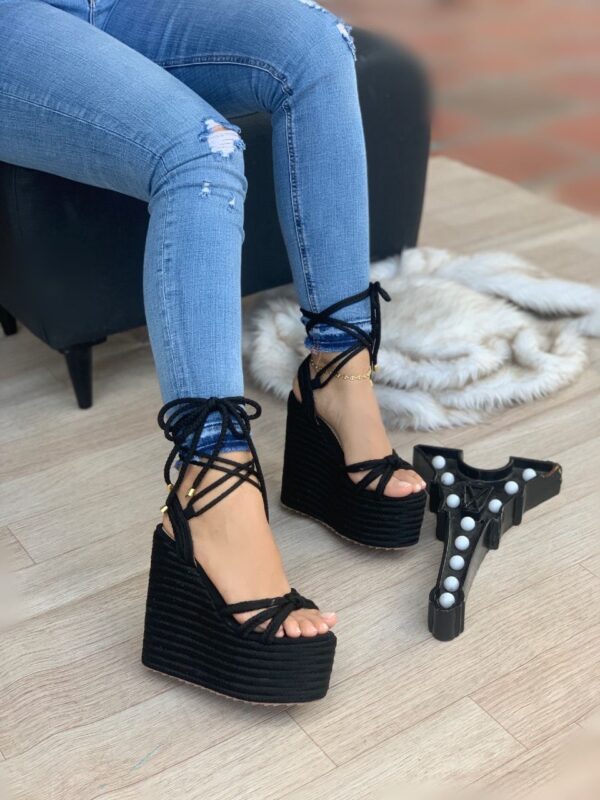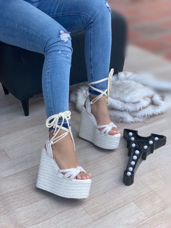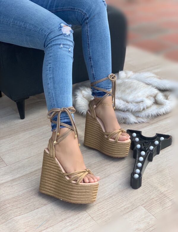 Sandalia en yute para mujer con plataforma alta y diseño moderno de amarre al tobillo. Fabricada en Colombia con materiales resistentes y terminados de calidad, es un calzado versátil ideal para looks casuales, urbanos y de verano.