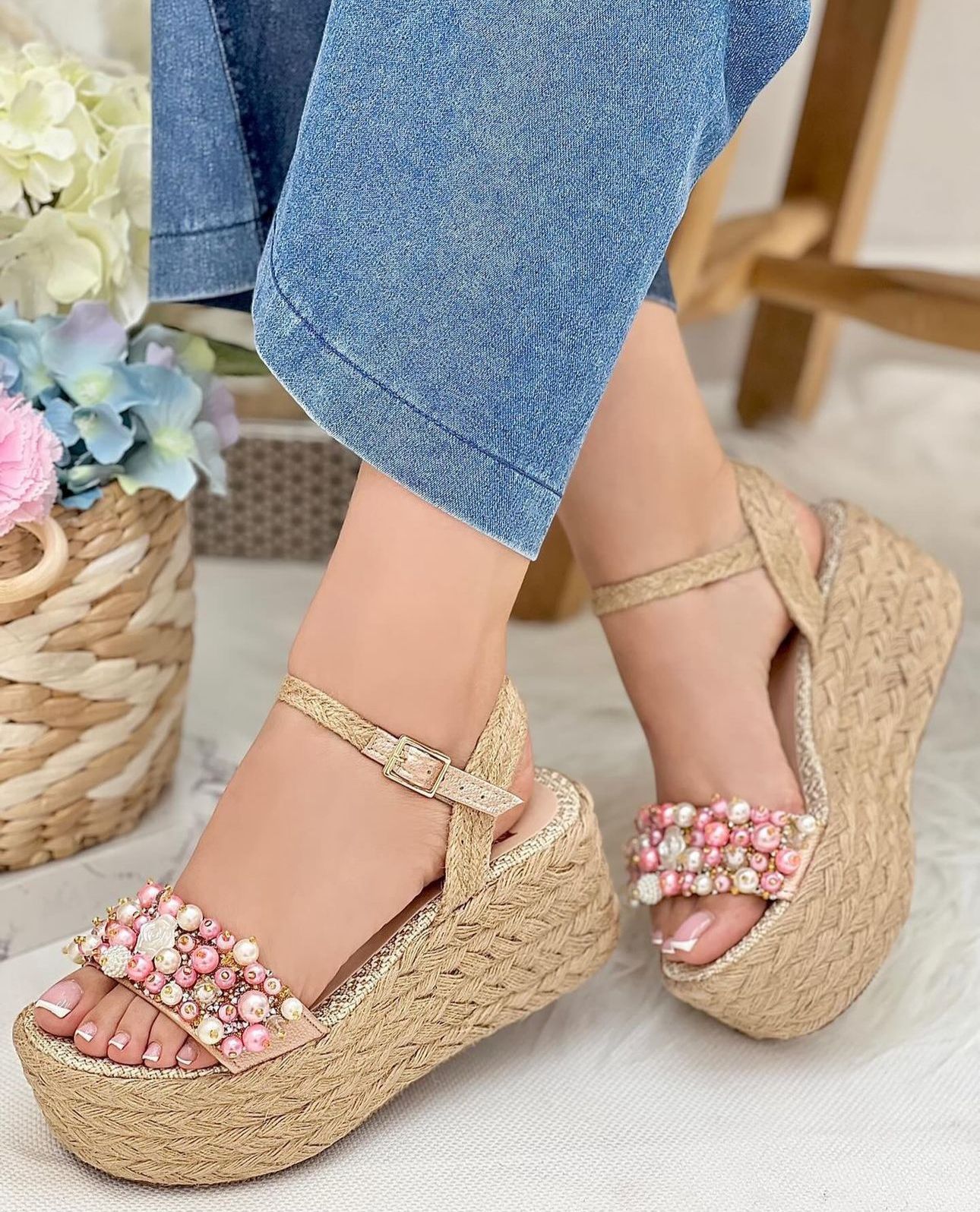 Sandalias de yute con plataforma alta y pedrería decorativa en tonos rosados y dorados. Disponibles en tallas 35 a 40.